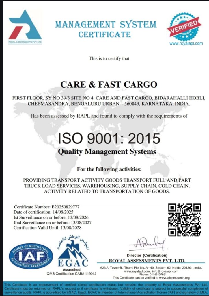 CARE & FAST CARGO is an ISO 9001:2015 Certified Company, Our aim at protecting customers interest by emphasizing that a quality product can only be created through quality processes.
